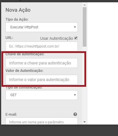 IMPORTANTE: No print abaixo, observe que existe um campo chamado “Usar Autenticação”. Algumas ferramentas externas, além da URL de autenticação utilizam esses dois componentes (chave e valor) como se fosse um usuário e senha. Isso serve para validar a integração.