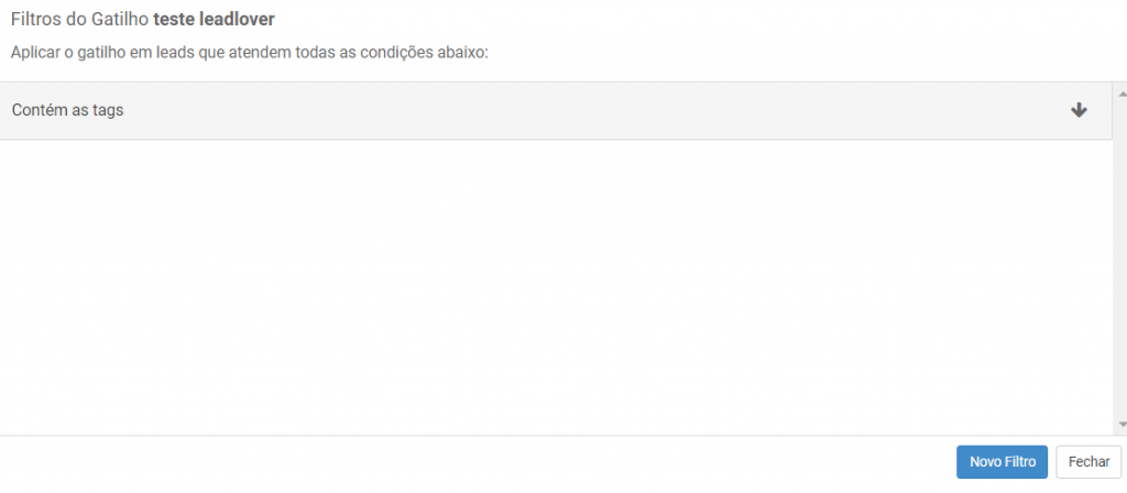 – Or: é pra os Gatilhos filtrarem pelos leads com uma tag ou outra tag, não sendo necessário o lead ter todas as tags. – And: é quando o gatilho irá filtrar pelos leads com duas tags, isso significa que nessa opção é obrigatório o lead possuir ambas as tags.