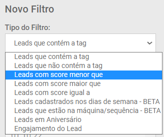 Os filtros disponíveis são: Leads que contém a tag, Leads que não contém a tag, Leads com score menor que, Leads com score maior que, Leads com score igual a, Leads cadastrados no dia da semana – BETA, Leads que estão na máquina/funil/sequência – BETA ou Leads em aniversário.