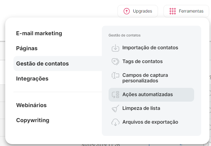 N2º – Passe o mouse por Gestão de contatos e selecione Ações automatizadas