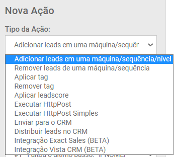 É possível criar estes Tipos de Ações: Adicionar leads em uma máquina/funil/sequência, Remover leads de uma máquina/funil/sequência, Aplicar tag, Remover tag ou Aplicar leadscore.