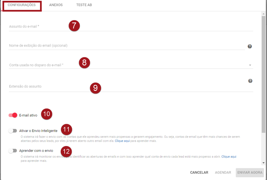 Nº 11 – No recurso Ativar o Envio Inteligente o sistema irá fazer o envio com as contas que ele aprendeu serem mais propensas a gerarem engajamento. Ou seja, contas de e-mail que têm mais chances de serem abertas pelos seus leads, por eles já terem aberto outro e-mail com ela. Para mais informações clique aqui.
