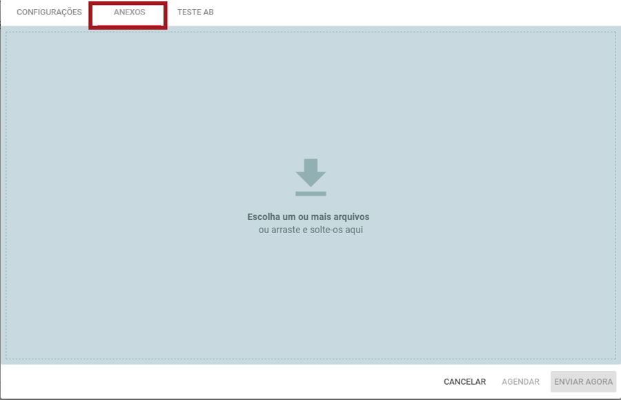 Nº 15 – Na aba Anexos você pode inserir arquivos para envio aos leads. Para anexar clique sobre a frase “Escolha um ou mais arquivos” que está em destaque no print acima. Por fim selecione o arquivo desejado em seu computador