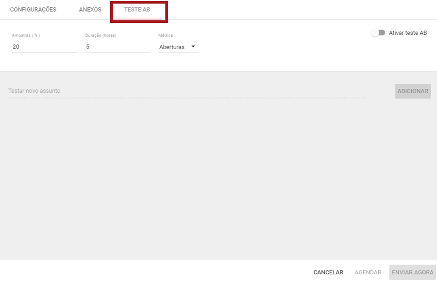 Nº 16 – Na aba Teste AB são executadas as verificações de qual assunto do e-mail será mais bem aceito pelos seus leads. Mais mais informações sobre este recursos clique aqui.