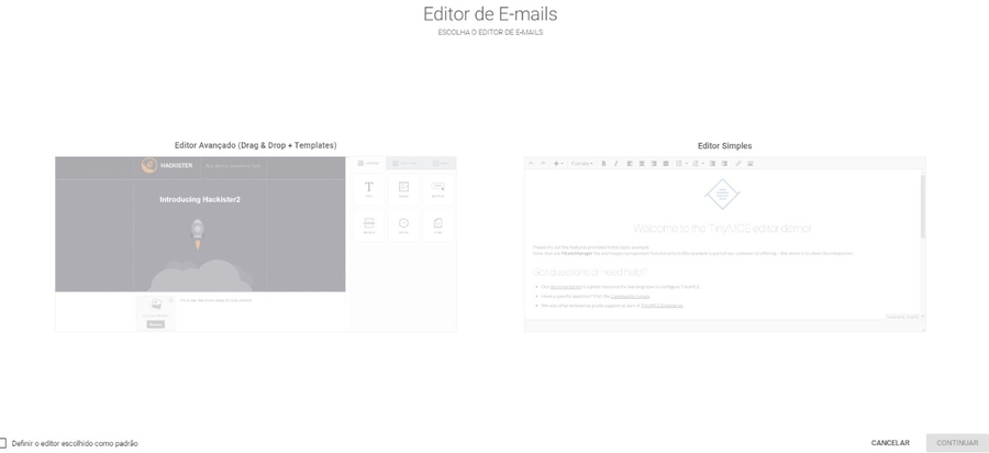 Para saber mais sobre como usar o editor simples clique aqui. Para informações sobre o construtor avançado clique aqui.