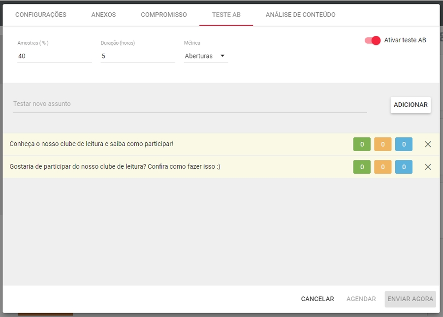 Para ficar mais claro, no nosso exemplo nós definimos dois assuntos: “Conheça o nosso clube de leitura e saiba como participar!” e “Gostaria de participar do nosso clube de leitura? Confira como fazer isso :)”. Os dois serão disparados durante 5 horas para 40% do total de leads que irão receber o e-mail. O sistema irá analisar então a métrica de aberturas e depois das 5 horas disparar o e-mail para o restante dos leads com o assunto que gerou mais engajamento.