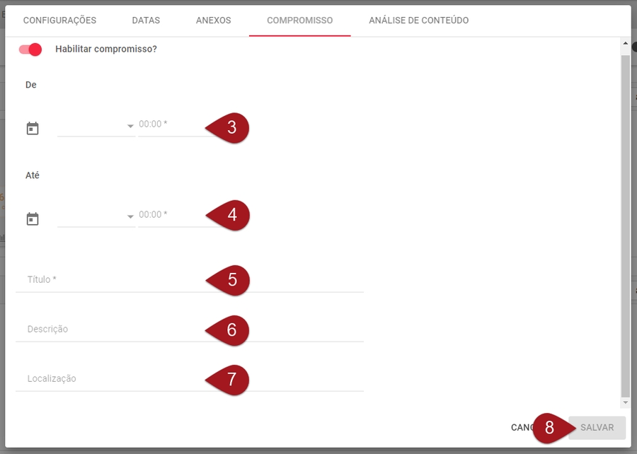 Objetivo: apresentar e mostrar como configurar a aba Compromisso das mensagens de e-mail. Para que serve: permite que insira em seu e-mail as informações de um evento/reunião para que o lead salve o mesmo em sua agenda online.