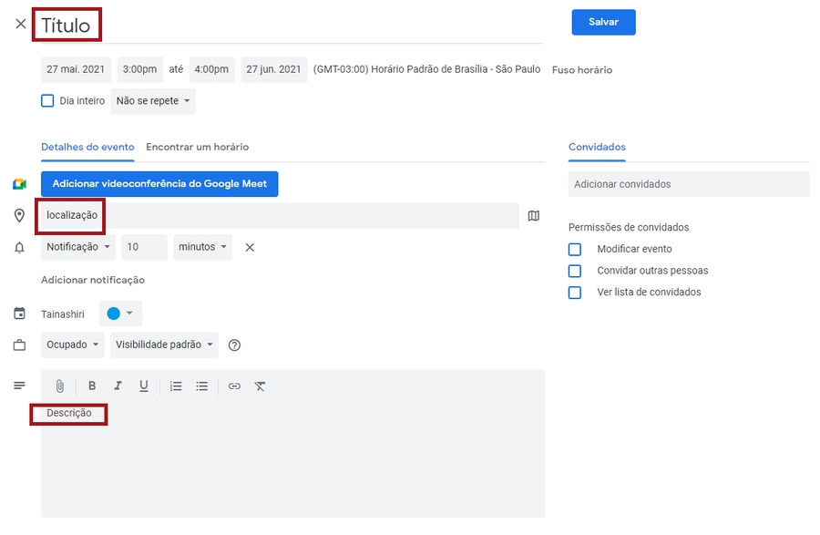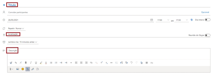 Nº7– E na Localização é possível informar o endereço físico ou virtual onde o encontro acontecerá. Você pode inserir links nesse campo, exemplo, o link de uma sala no Zoom.