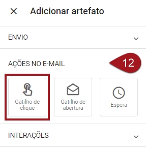 Nº12– Na aba que abrir na lateral direita, selecione “Ações no e-mail” e escolha a opção “Gatilho de clique”.