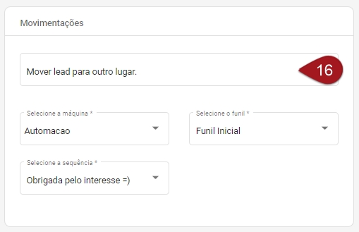 Nº16– Se em “Movimentações” você escolher a opção “Mover lead para outro lugar”, três novas opções aparecerão.