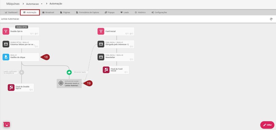 Nº19– Junto com ele, haverá um ícone indicando a movimentação que irá acontecer assim que o lead disparar o Gatilho de Clique no e-mail. Isso indica que tudo já está funcionando corretamente. Clique em “Publicar” no canto superior direito da página para salvar a sua Automação.