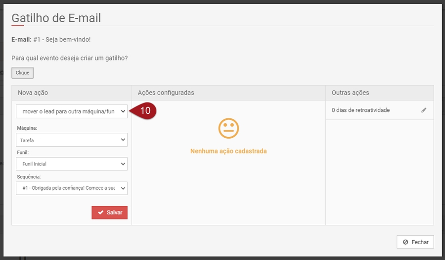 Nº10– Em “Nova Ação”, escolha a opção “Mover o lead para outra máquina/funil/sequência” e defina a Máquina, Funil e Sequência que o lead será enviado depois que clicar no link do e-mail. Salve as suas alterações.