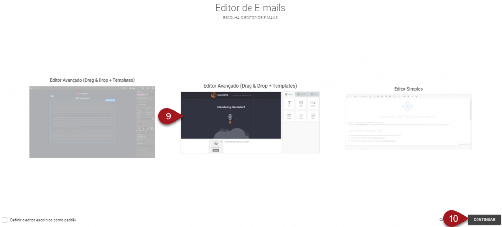 10– Clique em continuar para entrar na edição do e-mail. Escolha o modelo desejado e siga para a edição.