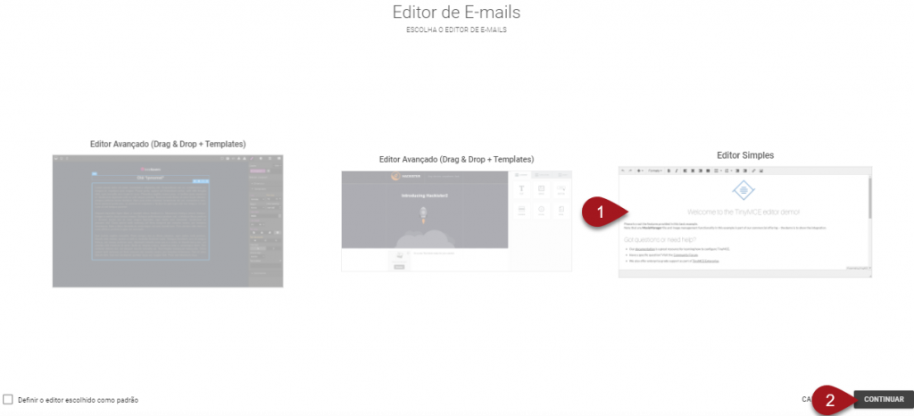 1 – Após clicar em criar novo e-mail, selecione o Editor Simples.