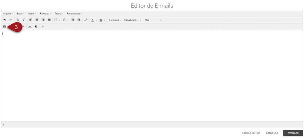 Se você já possui um e-mail criado pelo editor avançado, para acessa-lo para edição. Caso ainda não tenha criado, siga o passo a passo a seguir: 9– Após clicar em criar novo e-mail, selecione o Editor Avançado.