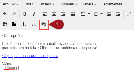 Nº1– Deixe o cursor do texto na parte do e-mail onde deseja inserir a tag, e clique no botão Inserir Tags.