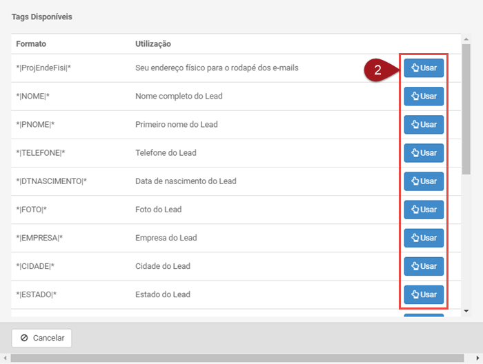 Nº2– Uma nova janela abrirá, com a lista de Tags disponíveis para uso. Agora é preciso escolher qual você quer inserir no campo de texto. Assim que localizar a desejada, clique em Usar.
