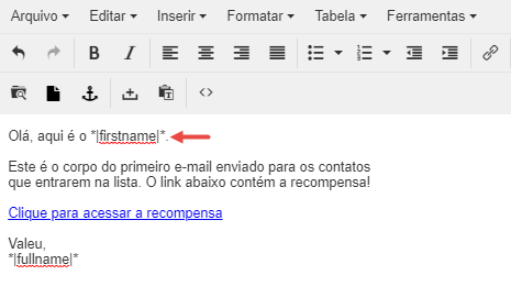 Se o lead que receber este e-mail tiver o primeiro nome de João, o assunto do e-mail, para ele, vai ficar: João, neste e-mail está nosso rico material!