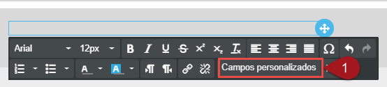 Nº1– Coloque o cursor do texto em uma parte do e-mail que permita a inserção de texto. Perceba aparece um quadro com diversas opções. Procure a opção Campos personalizados e clique sobre ela.