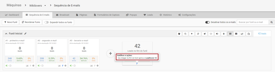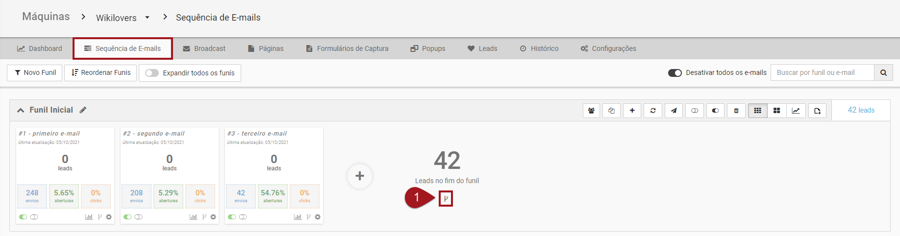 Objetivo: Simplificar os processos de movimentação de leads Para que serve: Realizar ações com os leads que estão no final do funil, como mover ou aplicar tag. Requisito obrigatório: Ter pelo menos um funil criado em uma máquina de Sequência de E-mails ou Automação.