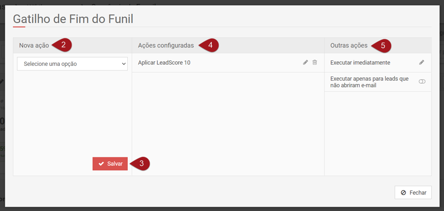 Nº2– Em “Nova Ação”, determine o que acontecerá com o lead assim que chegar ao fim do funil. Mais tarde explicaremos individualmente cada uma das ações.