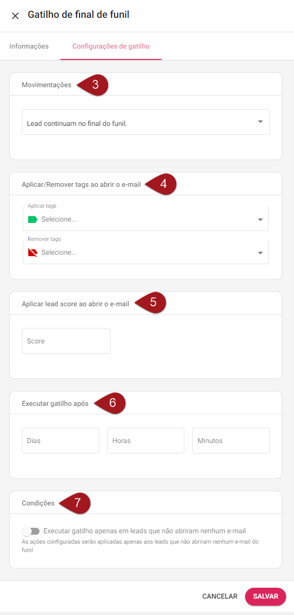 Nº7– Em “Condições”, ative a opção “Executar gatilho apenas em leads que não abriram nenhum e-mail” somente se quiser que o gatilho seja executado apenas para os leads que não abriram nenhum e-mail que está no funil. Ou seja, se o lead tiver aberto pelo menos um dos e-mails do funil, com esta opção marcada o gatilho não executará para ele.