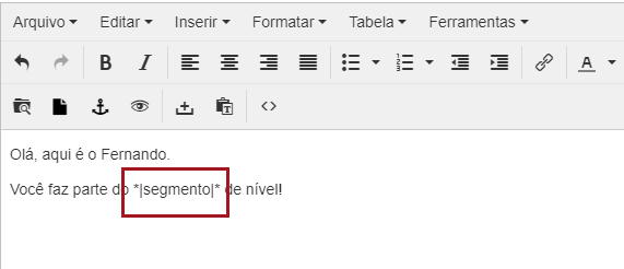 Nº5– Aplique a tag diretamente no corpo do e-mail, com os exatos caracteres do campo de captura, no seguinte formato (entre asteriscos e pipes): *|exemplo|*. Quando disparar o e-mail o local da tag será substituído com o conteúdo correspondente ao que o lead preencheu na captura.