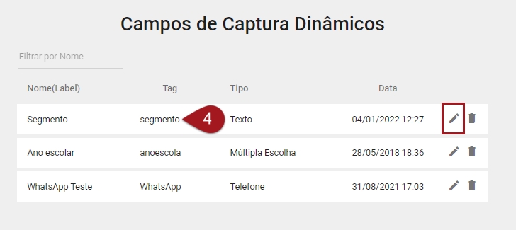 Nº4– Selecione e copie a tag que deseja utilizar (será a informação deste campo que será preenchida no corpo do e-mail). Caso precise editar a tag que inseriu no campo é só clicar no ícone de lápis, se não precisar, prossiga com os próximos passos.