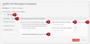 Nº9– Tanto na “Resposta com telefone” quanto na “Resposta com e-mail” a opção “Capturar telefone/e-mail identificado na resposta” é habilitada para marcar. Ela permite adicionar ao lead capturado o telefone ou e-mail que ele enviar na resposta da mensagem.