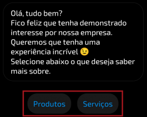 Já se você criar uma nova resposta, aparecerá a opção “Mostrar resposta como dica”. Todas as respostas cadastradas no gatilho que tiverem esta opção marcada aparecerão como sugestão para o lead clicar, assim como no print de exemplo abaixo.