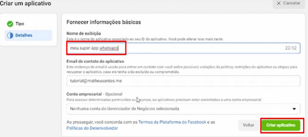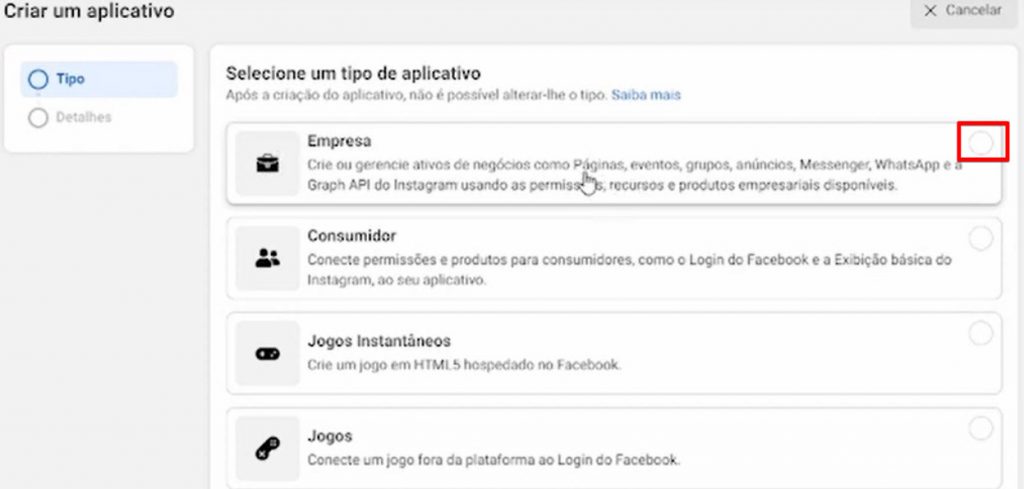 N2º – Em tipos de aplicativo, selecione o tipo “Empresa”. Essa opção é obrigatória. Lembre-se que o tipo de aplicativo não poderá ser alterado posteriormente.