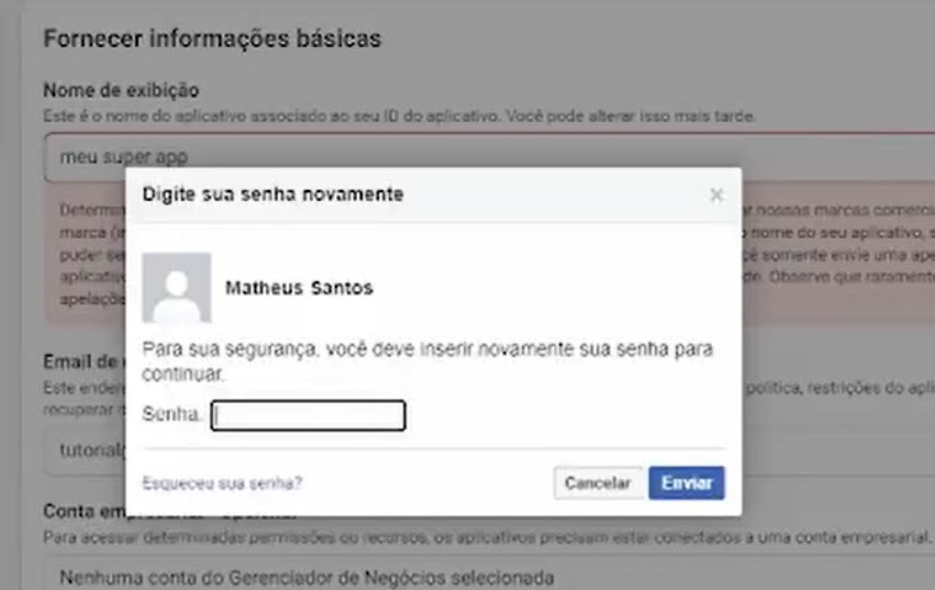 N4º – Aparecerá uma janela de confirmação, informe a sua senha do Facebook para criar o aplicativo