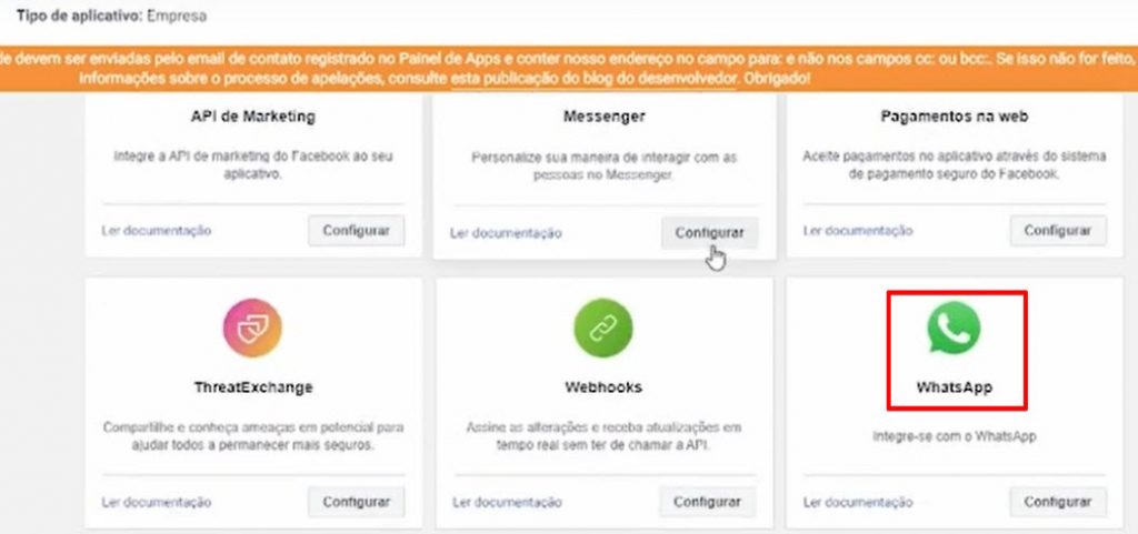 1- Retorne a área de aplicativos no Facebook developers, na parte de Whatsapp, clique em Configuração