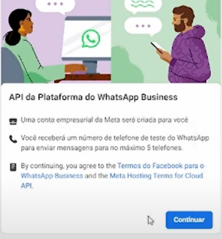 Após isso, o sistema informará que uma conta empresarial da meta será criada. Clique em “Continuar”, na sequência.