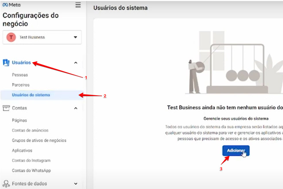 4- Agora, clique em usuários < usuários do sistema < depois em adicionar 5- Aceite os termos do facebook e clique em concluir.
