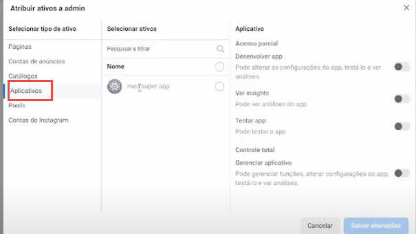 2- Escolha a opção aplicativos, e selecione o aplicativo criado anteriormente.