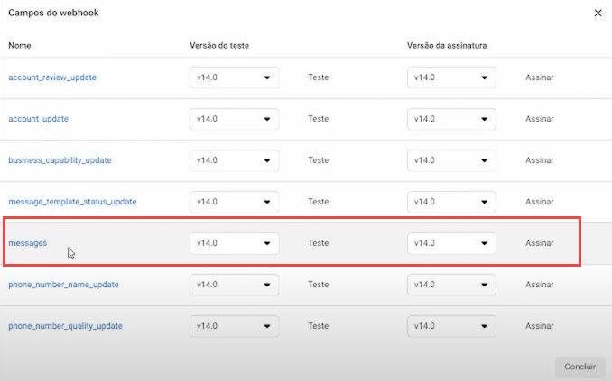 Para finalizar, Clique em gerenciar e ative a opção messages (mensagens)