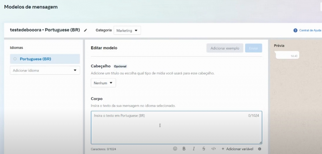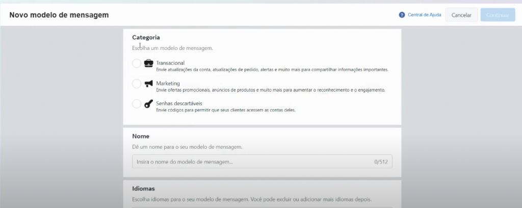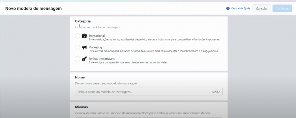 Para personalizar mensagens, o primeiro passo é criar um templates de mensagem. Por ter uma conexão oficial, as mensagens criadas via Cloud API precisam ser previamente aprovadas pelo Facebook.