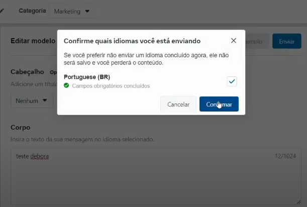 Após isso basta clicar em enviar Abrirá uma Popup para confirmação do idioma selecionado, apenas verifique e se estiver tudo certo clique em Continuar.