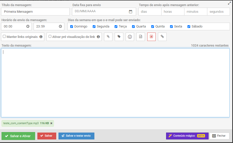 Nesse editor é possível criar seu conteúdo, adicionar links, imagens, anexos e muito mais. Você ainda pode clicar no botão de conteúdo mágico para ter uma ajuda na criação do seu texto. Conteúdo mágico é o IA da leadlovers, que te ajuda a qualquer momento a criar uma copy de sucesso.