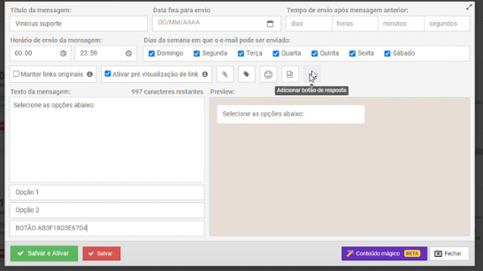 3- O primeiro passo é adicionar o botão em sua mensagem, em cada mensagem é possível habilitar até 3 botões.