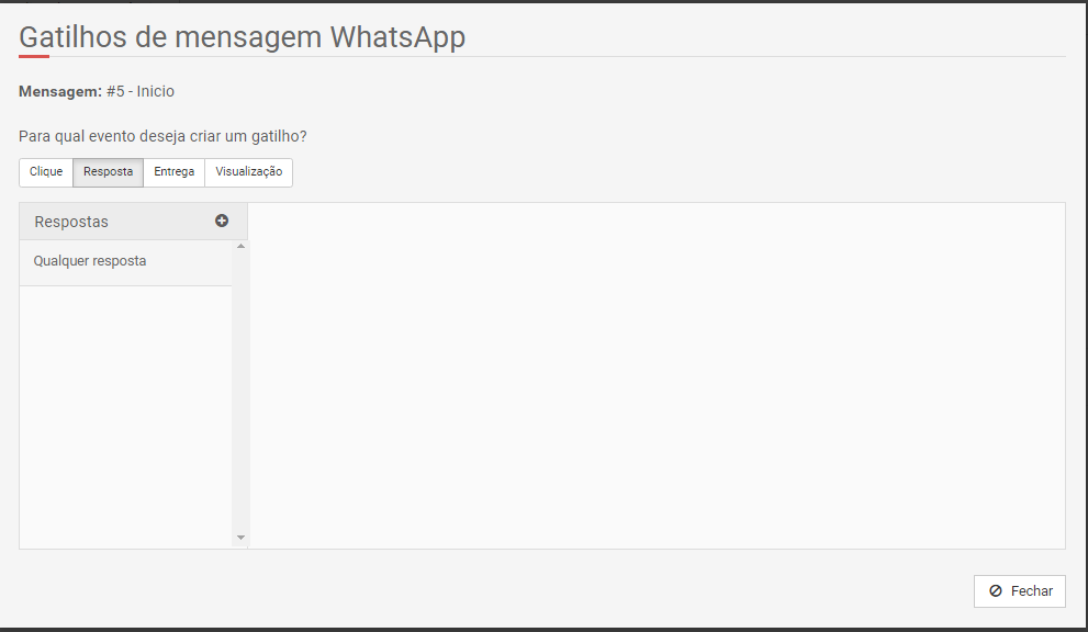 Deixando como “Qualquer resposta”, o gatilho será acionado com qualquer resposta dada pelo lead, mesmo que seja um emoji ou perguntas por exemplo.