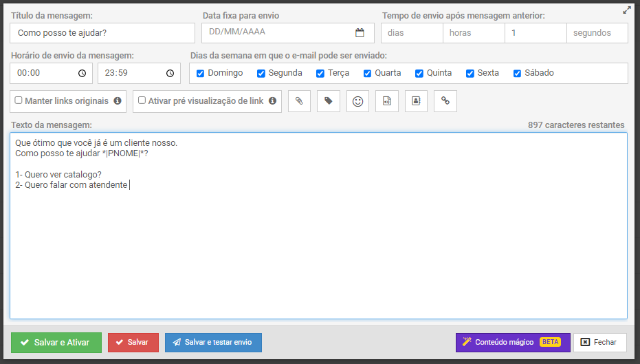 Após a criação do texto, salve e ative. E configure o gatilho de resposta conforme citado anteriormente.