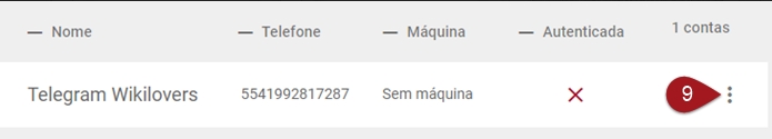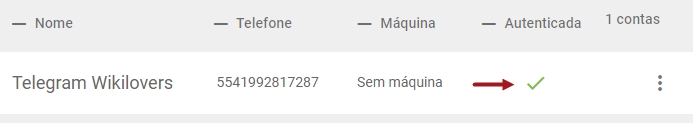 Novamente, você retornará a tela de Contas do Telegram. Agora, veja que na coluna Autenticada, o X foi substituído por um símbolo de check verde. Agora sua conta está ativa!