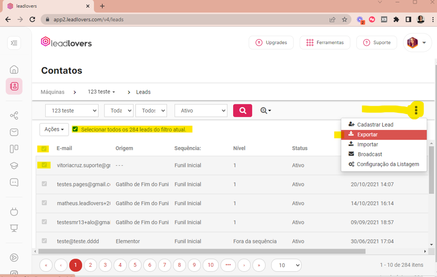 Neste exemplo a seguir, escolhi para listar todos os leads da máquina 123 teste e assim irão aparecer na sua tela.