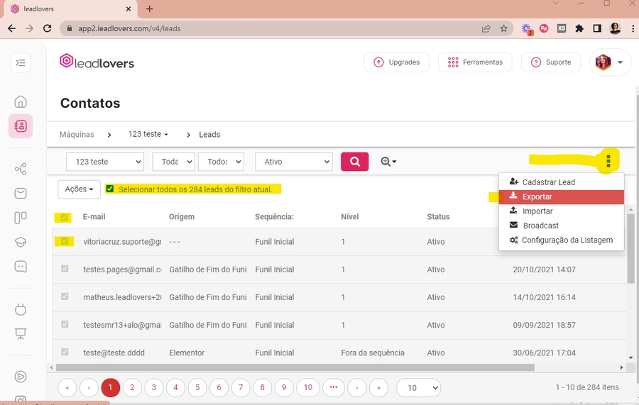 Com essa listagem, basta selecionar todos os leads da listagem e então clicar na opção exportar