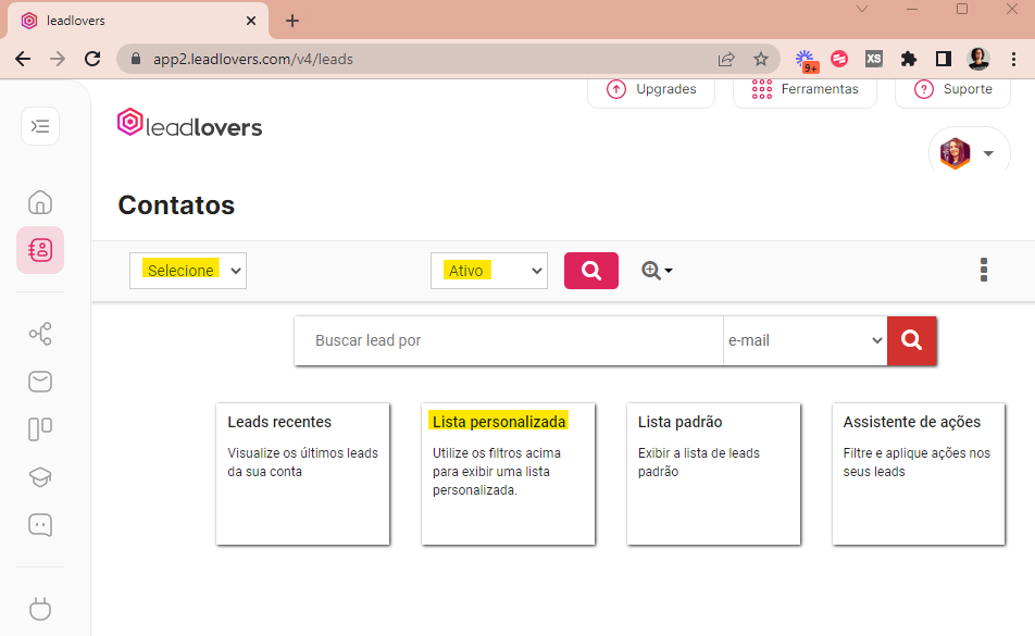 Aplique os filtros desejados para realizar uma busca que irá listar os leads. A opção Lista personalizada é a que tem mais opções de escolha.