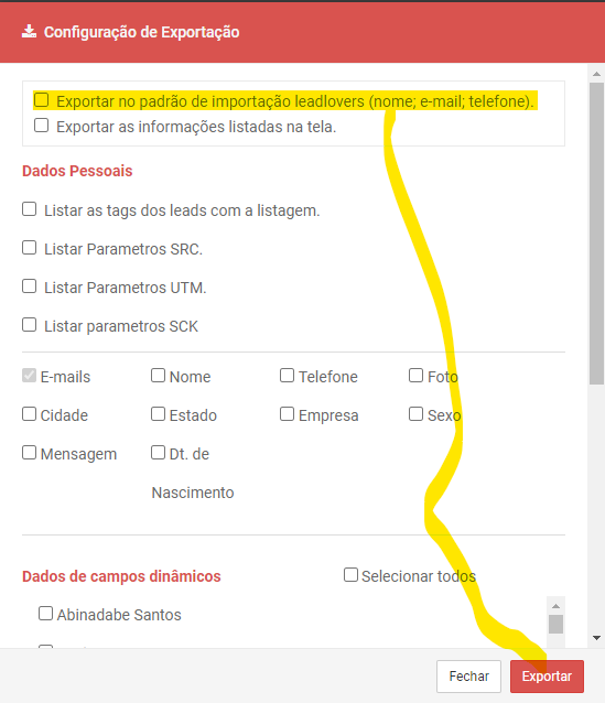 Para exportar uma lista com os dados padrão: nome; e-mail; telefone Basta escolher a primeira opção do pop-up e seguir com a exportação.