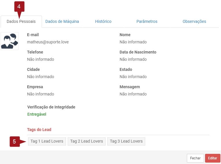 Nº 4 – Abrirá uma nova tela, com os dados Pessoais do lead