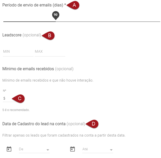 Quantidade de Emails recebidos: Aqui você define o número mínimo de emails recebidos pelo contato, no período de dias que você determinar, com os quais não houve interação (abertura ou clique).